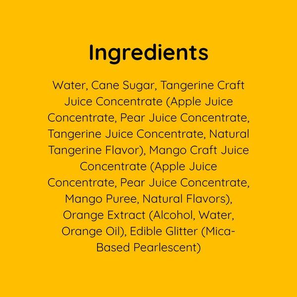 Get your sparkle on with our concentrated, glitter-infused Glitter Mimosa Mixer. It contains tangerine and mango in addition to FDA-approved edible glitter that is made from the mineral mica. There's absolutely zero micro-plastics or anything artificial. Just add 1/2 to 1 ounce of this mixer to a glass of sparkling wine or sparkling juice for a mimosa or "mock-mosa". Or follow our lead and add 1 ounce of this mixer to 1-2 ounces of white rum and a splash of seltzer on top for a fun, tropical cocktail.