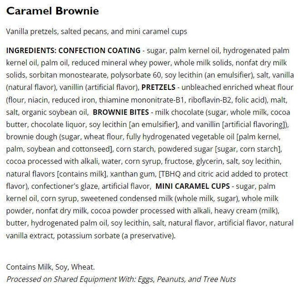 The home-baked goodness of rich and fudgy caramel brownies in a pretzel mix. Say hello to your new guilty pleasure with this combination of vanilla pretzels, mini caramel cups, and chocolate brownie bites!
